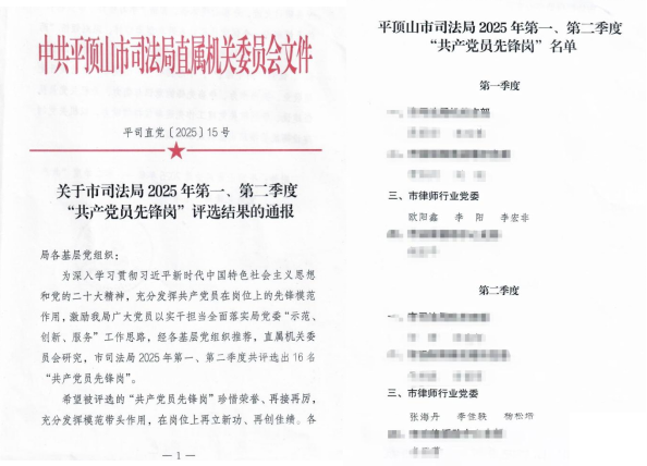 2025年10月14日,平顶山市司法局2025年第一、二季度“共产党员先锋岗”授牌仪式主题党日活动在局六楼会议室举行。来自市律师行业的李阳、欧阳鑫、李宏非、张海丹、李佳轶、杨松培等6名同志被评选为市司法局“共产党员先锋岗”。李阳同志作为“共产党员先锋岗”人选代表进行了交流发言。
