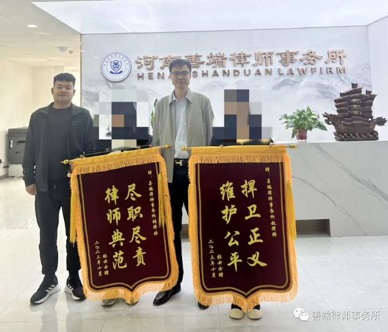 2023年10月10日,当事人张某(化名)等将两面绣着“捍卫正义,维护公平;和尽职尽责,律师典范”的锦旗送到河南善端律师事务所,以感谢河南善端律师事务所律师为他们维护合法权益尽心尽力尽责之举。
